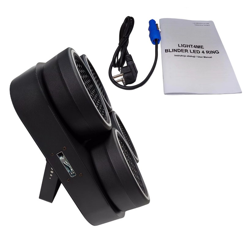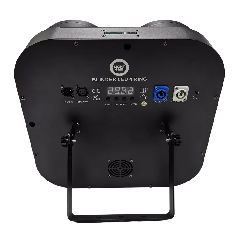Light4Me Blinder Led 4 Ring ma solidną, metalową obudowę, a dzięki dokręcanemu do niejuchwytowi montażowemu, blinder może być ustawiony na podłożu pod odpowiednim kątem w stosunku do oświetlanej powierzchni ✅. W przypadku potrzeby oświetlenia z góry, może być również zainstalowany na kratownicach i rampach oświetleniowych. Na tylnej ścianie urządzenia znajdują się gniazda zasilania typu powercon (w tym wyjście powercon „podaj dalej” umożliwiające przekazywanie napięcia bezpośrednio z urządzenia do urządzenia), 3-pinowe gniazda XLR służące do sterowania reflektorem za pomocą protokołu DM oraz intuicyjny panel sterowania składający się z wyświetlacza i 4 przycisków ✅. Możemy w prosty sposób wybrać jeden z 3 trybów pracy urządzenia: