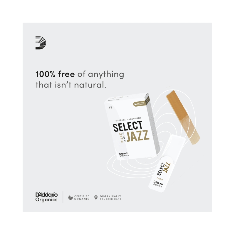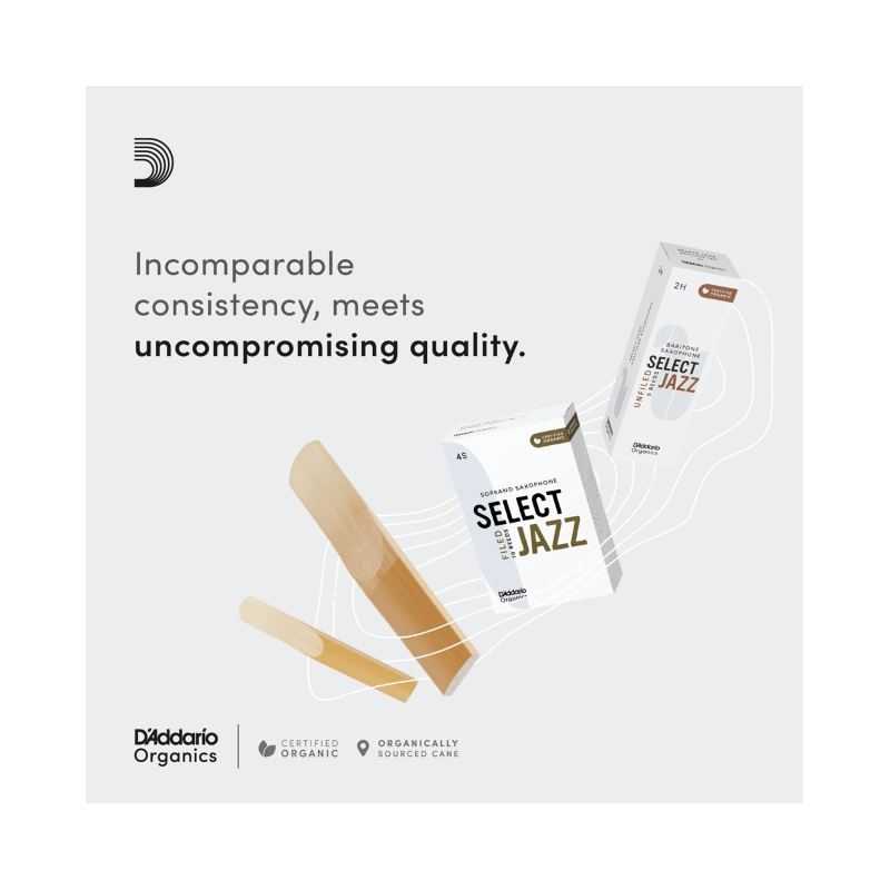 Organic Select Jazz oferuje doskonałą projekcję, klarowność i żywe brzmienie. Stroiki Select Jazz są dostępne w wersjach profilowanej i nieprofilowanej, a także sprzedawane w trzech opcjach (soft, medium, hard) dla każdego rozmiaru dla optymalnego dopasowania do ustnika. Stroik zapakowany w nadającą się do recyklingu papierową osłonkę na stroik i folię.